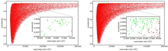 In Figure 4, we show the eccentricity-semi major axis plots of the comets that display elliptic trajectories both before (left panel) and after (right panel) the gravitational transition, in the case of the initial random velocity perturbation range . It is evident that the number of comets that reach the planetary region (green points) has nearly tripled after the gravitational transition, even though it is still very small compared to the number of comets that remain outside the planetary region.