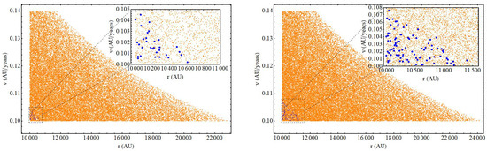 The velocity perturbation magnitude vs the initial position plots of the comets in the Monte Carlo simulations that are initially in stable orbits staying at perihelion distance larger than . The orange points correspond to the comets whose elliptic trajectories remain outside the solar system despite the velocity perturbation, whereas the blue points correspond to those that enter our solar system after the same initial velocity perturbation. Left panel: The comet initial phase space coordinates before the gravitational transition. Right panel: The comet initial phase space coordinates after the gravitational transition has occurred, increasing the gravitational strength by . Notice the significant increase in the number of comets that enter the solar system.
