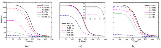For a system with infinite volume, critical temperatures calculated with the local criterion are always higher than the ones calculated with the global criterion [84,85], but with Dirichlet conditions systems with very small volumes, the opposite happens: local criterion critical temperatures are lower than global criterion ones. This feature can be observed by comparing the phase diagrams for fm in Figure 3a and Figure 4a: for the local criterion MeV and for the global criterion MeV. For fm in the local criterion, chiral symmetry is almost restored at MeV, while this happens in the global criterion at MeV.