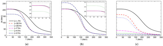 The behavior of constituent mass with increasing system temperature and decreasing system volume is shown in Figure 2. The order parameter is smooth for the whole interval, which implies the existence of a crossover at . The APBC results in Figure 2a indicate that a very small volume is needed to observe the effects of the system size. For fm, the thermodynamic limit is reached; however, for fm, the constituent mass is 206.624 MeV, which has a negligible mass difference of 1.641 MeV compared with fm.