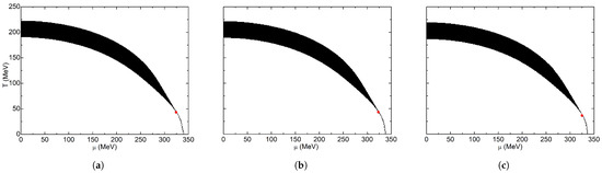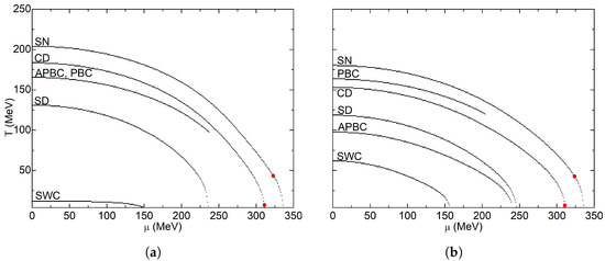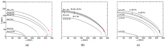 In Figure 3, the phase diagrams corresponding to the local criterion are shown; the solid red dot represents the CEP, which separates the crossover region from the first-order phase transition. In the limit when , the critical temperature is MeV, and the CEP is at MeV and MeV. For spherical geometry with Dirichlet conditions in Figure 3a, critical temperatures decrease with decreasing volume; CEP shifts quickly toward lower temperatures and slowly toward lower chemical potentials. For fm, the CEP disappears, and only a crossover region between both phases is obtained. The smallest computed volume is for fm, where chiral symmetry is practically restored at MeV. With the same geometry, but with Neumann conditions, the diagrams in Figure 3b were obtained; it is observed that the volume effect is negligible until fm, where temperature has decreased from MeV at to only MeV. Hence, CEP coordinates are almost the same. With this boundary condition, volume effects are minimal because there is not a surface term in the density of states. For fm, the CEP disappears; hence, the line represents the crossover region. These two results are quite similar to the ones reported by [73] at the chiral limit; they reported that the temperature and chemical potential of the tri-critical point reduce as R decreases. At fm, the tri-critical point disappears, and the first order region vanishes. For Neumann conditions, they report that the critical temperature decreases considerably only when the size goes below fm, and the tri-critical point disappears when fm.