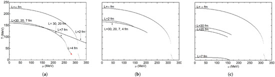 The finite sizes used in this work lead to considerably lower critical temperature values compared to the ones with infinite volume. Phase diagrams in Figure 5a correspond to APBC, where MeV is constant for and 4 fm. However, for and 20 fm, our calculations converged until around MeV. Introducing a finite volume to the calculations leads to unavoidable computation problems because of the lack of convergence of the gap Equation (2) at the zone of the phase diagram where the temperature is low and the chemical potential is high. As volume decreases, this chemical potential convergence limit increases. As a result, our phase diagrams reach higher chemical potential values. At fm, critical temperature diminishes slightly by 6 MeV compared with higher finite volumes. The lines shown in the figure represent the crossover zone, but for fm a CEP exists. This particular result is described in more detail in Figure 7. These results generally agree with the ones reported by [86], where DSEs are used to study a cubic box with antiperiodic boundary conditions. They report that the pseudocritical line stretches toward larger values and smaller T values as system size decreases. Similarly, CEP coordinates move toward higher values and lower temperature values: from MeV and MeV at , to MeV and MeV at fm. They found that critical temperatures remain nearly constant for larger volumes. They did not continue with the construction of the phase diagram for temperatures smaller than 60 MeV due to computational complications derived from the Matsubara frequencies.