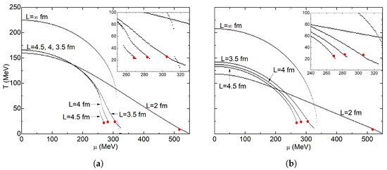 In the Linear Sigma Model coupled to quarks, ref. [87] studied the finite volume effects with PBC and APBC. They found that as system size decreases, the CEP quickly moves toward very high chemical potential values and low temperature values: from MeV and MeV to MeV and MeV for PBC; and to MeV and MeV for APBC. In addition, the crossover temperature rises as the system size decreases. This effect is more notable for PBC, where temperature increases for and fm. By working with the Quark–Meson model formalism, ref. [88] found that the CEP moves toward lower temperatures and higher chemical potentials as the volume decreases: from MeV and MeV at to MeV and MeV at . They found a similar behavior with APBC and PBC.