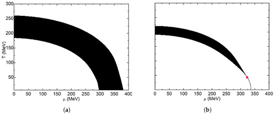 and the trace is taken in color, flavor and Dirac spinor spaces. In the gap Equation (2), the two remaining free parameters are the (finite) temperature (T) and the chemical potential (), so this equation can be solved self-consistently for any two given values of T and to obtain a description of the thermodynamic state at those conditions. To study the thermodynamic properties of the system at a determined region in the plane, we work with the thermodynamic potential per unit volume [58] in the imaginary time formalism. We perform a Wick rotation , and the temperature and chemical potential are introduced by means of [59,60]