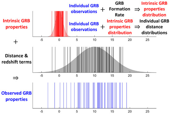 In the absence of any redshift knowledge, as is the case with the BATSE catalog [1,23] and most SGRB catalogs, we can still adopt a multilevel Empirical Bayesian methodology to estimate both the redshifts and the intrinsic properties of individual GRBs probabilistically. This novel approach may resemble magic as it enables us to infer two unknowns (the red distribution and the black lines in the subplots of Figure 1) from a single known quantity (the blue-colored lines). However, the power of the method stems from our ability to include an independent prior knowledge of the overall redshift distribution of GRBs in the analysis. This prior knowledge is represented by the gray distribution in the middle subplot of the figure. It can be chosen to be any plausible intrinsic GRB cosmic rate scenario. For LGRBs, the prior could be set to the most recent SFR models in the literature [24,25], or the hotly debated LGRB cosmic rate models that deviate from the SFR at low redshifts [9,26,27,28] or at high redshifts [8,29]. In the case of the Fermi catalog, the available 120 spectroscopically and photometrically measured redshifts can be compared with the corresponding predicted redshifts using this Empirical Bayesian approach. Finally, quantifying and tabulating the results of this comparison via simple linear correlation measures for different prior models enables us to identify the most plausible cosmic rate model for GRBs.
