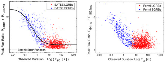 As an alternative, the effects of the gamma-ray detectors can be accounted for by modeling the detection threshold as part of the modeling of GRB properties [7,37]. For example, to remove the strong dependence of the detection threshold of Fermi-GBM on the timescale used for the definition of a GRB’s peak flux, we can define an effective timescale-free peak flux for all BATSE and Fermi GRBs. The existence of such an effective peak flux is noticeable in the plot of the ratio of GRB peak fluxes at different timescales as a function of their observed durations. Figure 3 illustrates the strong dependence of the peak flux ratios at 64 ms and 1024 ms timescales on the durations of GRBs measured by in the BATSE and Fermi catalogs. The two GRB classes are segregated via fuzzy classification methods [37,48,49] applied to and of the events in both catalogs [50]. We have already shown [7,37] the utility of this relationship in removing the effects of varying-timescale detector thresholds from the BATSE catalog. A similar procedure can be adopted for modeling the detection thresholds of Fermi-GBM and Swift-BAT gamma-ray detector thresholds. In the case of Fermi-GBM, the difference is minimal and amounts to only a wider range of triggering timescales ( s to s) compared to that of BATSE (64 ms to s). Furthermore, a realistic modeling of the detection threshold requires modeling the inherent fluctuations in the background gamma-ray photon counts as a Poisson process [22,37], leading to a fuzzy detection threshold at any given triggering timescale. This approach properly includes all GRBs in any catalog, down to the faintest events.