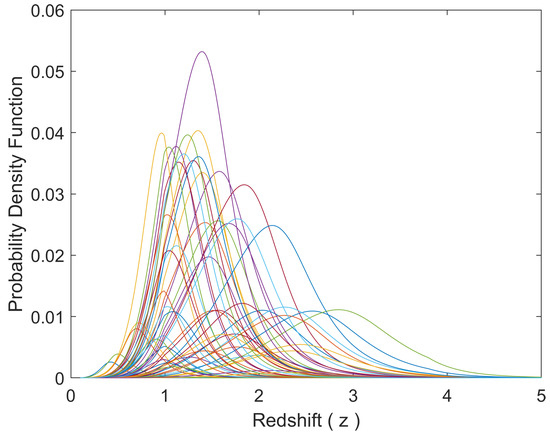 where C represents the speed of light and represents the Hubble constant. The cosmological parameters in Equation (12) are set to , , and [61]. If the three rate models, , and their parameters were known a priori, one could readily compute the PDFs of the set of unknown redshifts of all BATSE SGRBs,