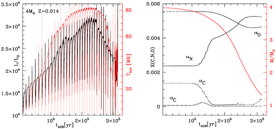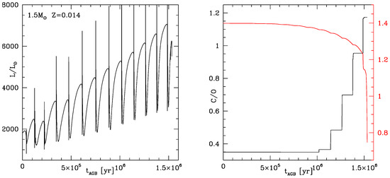 An example of the AGB evolution of a low-mass star not experiencing HBB is shown in Figure 1, which reports the time variation of the main physical and chemical properties of a star of solar metallicity. The results in the left panel of the figure show the gradual increase in the luminosity of the star, due the increase in the core mass as the hydrogen burning shell moves outwards (in mass) [35]. The effects of the various TDU events can be seen in the sudden rise in the surface C/O ratio, shown in the right panel of Figure 1. The surface carbon enrichment and the achievement of the carbon star stage favour a significant increase in the surface molecular opacities [36], which causes a large expansion of the star, a decrease in the surface gravity and the increase in the mass loss rate [37,38]. This can be seen in the run of the total mass of the star in the right panel of Figure 1 (red line in the figure), where it is evident that the decrease in the total mass becomes much faster after the star becomes a carbon star, which in this specific case occurs after the last TP experienced. The large sensitivity of the surface molecular opacities to the carbon content of the envelope somewhat prevents the accumulation of surface carbon in excess of ∼ of the overall mass fraction, as the loss of the envelope inhibits the occurrence of further TDU episodes.