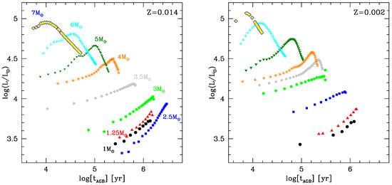 The comparison between the results reported in the two panels of Figure 3 shows that lower metallicity stars reach higher luminosities for a given initial mass, as they evolve on more massive cores [33]. Metallicity also affects the minimum threshold mass required to ignite HBB, which decreases from , in the solar metallicity case, to , for .