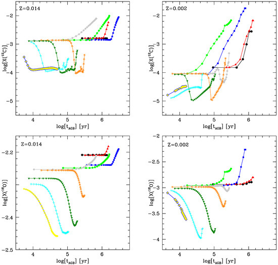 The difference between the behaviour of the stars experiencing HBB and that of the lower mass counterparts is particularly evident in the variation of the surface chemical composition. This is shown in Figure 4, which reports the variation of the surface carbon (top panels) and oxygen (bottom panels) for the same model stars shown in Figure 3. The surface carbon of stars increases during the AGB, owing to the action of repeated TDU episodes, until reaching abundances of the order of ∼; the higher the initial mass, the larger is the final mass fraction of carbon at the surface of the star, because the stars of higher mass experience a higher number of TPs (hence of TDU events) before the envelope is lost. The surface carbon content reached during the final evolutionary phases is approximately independent of the metallicity, as the carbon dredged-up to the surface after each TP is of primary origin, being produced in the helium burning shell.