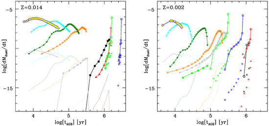 An exception to the general rule that dust production by low-mass AGBs during the phases when they are oxygen rich is negligible, is represented by the stars that fail to achieve the C-star stage. An example of this class of objects is represented by the model star of solar metallicity, whose behaviour is shown in the left panel of Figure 5. The DPR experienced by this star at the end of the AGB phase is higher than the DPRs of the stars experiencing soft HBB (as the star, indicated with grey diamonds in the same panel of the figure) and is also much larger than the DPR reached by low-mass stars of the same metallicity during the oxygen-rich phase. This behaviour is explained by the increase in the mass loss rate that takes place during the final AGB phases, which causes an increase in the DPR. These stars should be at the origin of presolar AlO grains recovered in meteorites [41]. A thorough understanding of the origin of these particles requires considering the effects of non-standard stellar mixing in the calculation of the evolutionary sequences [28]; however, as stated in Section 2, this is far beyond the scopes of the present investigation.