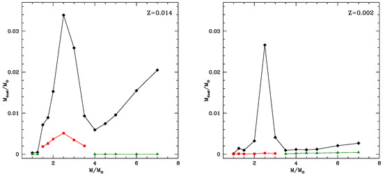 The total mass of stars with the initial mass reported on the abscissa is indicated with black diamonds for the metallicities (Left) and (Right). Red squares and green triangles indicate the contribution due to SiC and alumina dust, respectively.