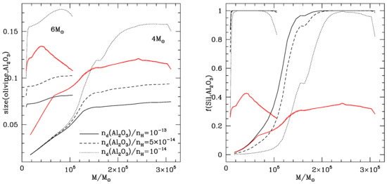 The reason for this difference is in the hybrid nature of olivine and pyroxene, discussed in Section 2, with both species being composed by a generally dominating magnesium component, coexisting with an iron component [2]. In the standard case with no drift the magnesium components account for ∼ of olivine and pyroxene (these are the values attained by the and quantities discussed in Section 2), a condition which favours the formation of olivine dust with respect to pyroxene. When drift is considered, the growth rate of the dust grains increases, which according to the discussion in Section 2 favours the decrease of both and , with the equilibrium of both the species shifting towards higher percentages of the iron component, which now accounts for ∼ of the total of olivine and pyroxene. Under these conditions, pyroxene turns out to be most stable species, thus providing the dominant contribution to the formation of silicates. For readability we show in the bottom, left panel of Figure 7 only the case; however the conclusions given above hold generally for all the stars exposed to HBB.