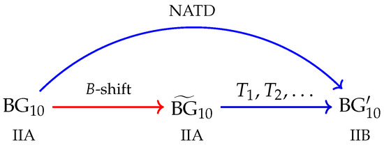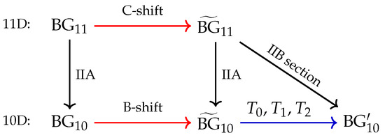 One becomes naturally interested in a generalisation of the obtained results to exceptional field theories to general manifolds with isometries along the lines of [30,31,35]. In this case, symmetries manifest themselves in the algebra of Killing vectors, which can be used to organise a tri-vector shift, in contrast to the 3-form shift in the present paper [62,63]. This provides tri-vector deformations of 11-dimensional backgrounds, which in certain cases follow the same scheme as in Figure 2, e.g., one considers the tri-vector deformation of Minkowski space–time, which in the IIB frame is again a Minkowski space–time, while solving the equations of generalised supergravity in the IIA frame [62]. A more detailed analysis of the relations between deformations and non-abelian dualities is required.