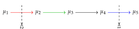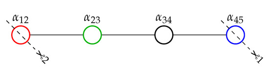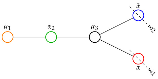 Dynkin diagram of with simple roots coloured differently for further convenience. Depending on the two possible ways to delete one root keeping three connected, depicted by