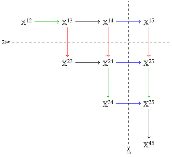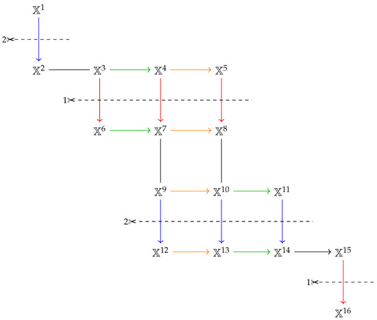Weight diagram of the fundamental of with the highest weights represented by . The action of different roots is denoted by different colours, and the direction of arrows shows the lowering of the weight. Depending on the chosen deletion of a simple root, one obtains two different decompositions under .