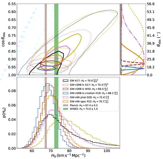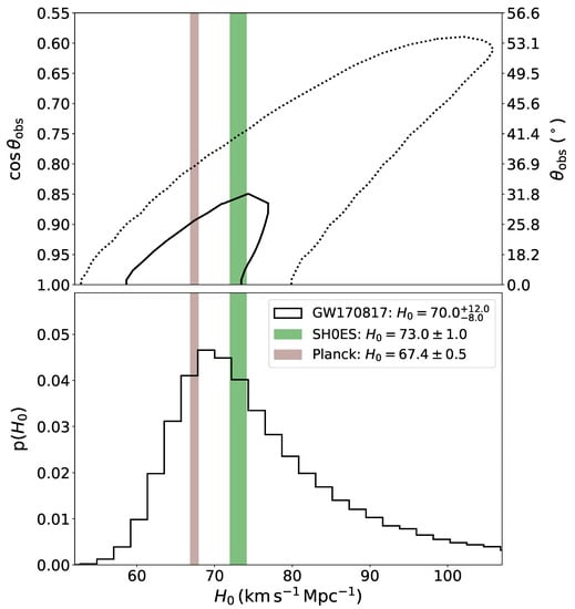 Notwithstanding the uncertainties in the light curve modelling, two studies in the literature [11,13] used the inferred constraints on the viewing angle to reduce the distance–inclination degeneracy in the standard siren approach and therefore improve on . Guidorzi et al. [11] modelled the first ∼40 days of X-ray and radio data of GW170817 for two different choices of the jet opening angle, and , and for varying viewing angles, jet parameters and densities of the circum-burst material. A uniform top-hat jet model was assumed [88,89]. The inferred viewing-angle distribution spanned a relatively wide range of , with a slight preference for a jet opening angle of . When adding this inclination constraint as a prior to the Hubble constant determination, MAP values of and km s Mpc were found for and , respectively. The mild () improvement on derived with the wider opening angle is shown with light-green curves in Figure 2. A similar analysis was later carried out by Wang and Giannios [13], who modelled the radio data of GW170817 up to days with a realistic jet structure derived from general-relativistic magnetohydrodynamical simulations. The modelling of this extended dataset covering the light curve peak led to a significant improvement on the inclination constraint compared to Guidorzi et al. [11], with an inferred value of . We note that this precise value for may be partly due to the specific model adopted displaying a rather strong viewing-angle dependence. The Hubble constant was constrained to km s Mpc, with the uncertainties reduced by more than a factor of two compared to those from the GW-only analysis. The constraints from Wang and Giannios [13] are shown in red in Figure 2.