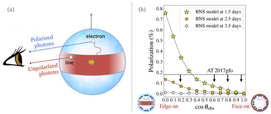 In BNS mergers, the combination of unpolarized light from equatorial regions and polarized light from polar regions leads to an imperfect cancellation of the different polarizing contributions and thus to a net polarization signal for most viewing angles. As illustrated in Figure 3, this effect is stronger when the system is viewed edge-on (i.e., 90° away from the jet axis; see “Edge-on” inset in the right panel) and decreases when moving towards the jet axis, at which point, the ejecta become symmetric in projection and all of the polarising contributions cancel each other (see ’Face-on’ inset in the right panel). Bulla et al. [154] predict a maximum polarization level of ∼0.8% in the optical (7000 Å) 1.5 days after the BNS merger, rapidly dropping to zero within ∼1–2 days (right panel of Figure 3). These predictions can be compared to polarimetric observations taken for AT 2017gfo with the VLT FORS2 instrument [156]. The —band polarization of AT 2017gfo at 1.5 days was consistent with being caused (at least in part) by interstellar dust in our own galaxy, and an upper limit of was placed by Bulla et al. [154] after the careful removal of the interstellar contribution. Comparing these upper limits with the polarization predictions at 1.5 days (Figure 3), the viewing angle of the system is constrained to be relative to the jet axis ().