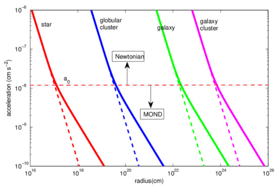 Figure, courtesy of M. Milgrom, taken from http://www.scholarpedia.org/article/The_MOND_paradigm_of_modified_dynamics, (accessed on 31 March 2020) showing its predictions, which are consistent with experimental observations. Plotted is the acceleration as a function of the distance from an isolated mass M, for a star with (red), a globular cluster with (blue), a galaxy with (green), and a galaxy cluster with (magenta), in which represents one solar mass.