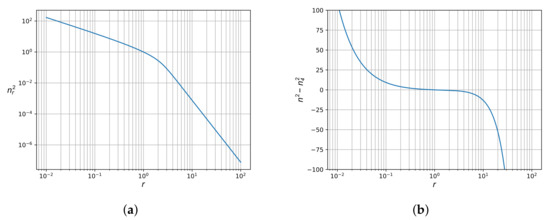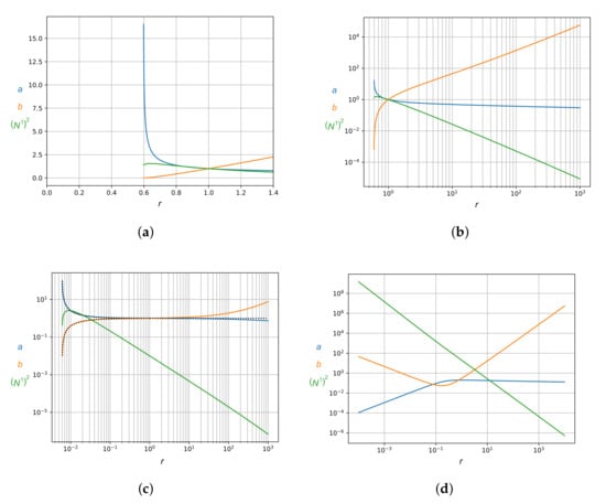 Numerical solutions of Equations (101) and (102). (a) Graph with showing a “black hole”-type singularity at . (b) Same as for (a), but on a log–log plot. Note the blow up of as . (c) Graph with and . Comparing this with (b) and taking note of the different vertical scales, one can see the approach to the usual Schwarzschild solution as . (d) Graph with , , and showing a different type of solution with no critical “black hole” radius, but rather, a singularity at . The solution for still clearly blows up as .