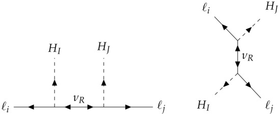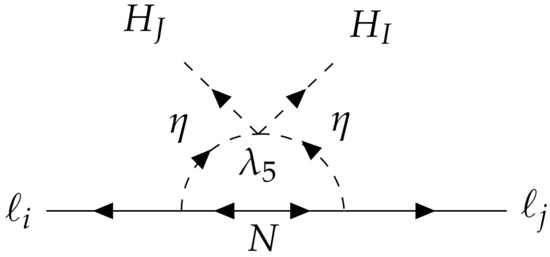 The symmetry prevents the appearance of tree-level Majorana masses for the left-handed neutrinos, but it can generate them at the one-loop level through the mixing of with the SM Higgs doublet, as shown in the diagram of Figure 4. The resulting neutrino mass matrix is calculable, and, for (), can be approximated as [47]