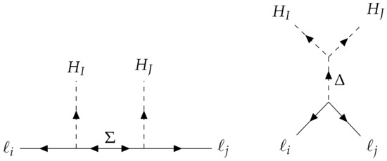 with the coefficient . When the Higgs doublet gets a VEV, neutrinos acquire Majorana masses through the Weinberg operator , that agree with Equation (22). Moreover, the following dimension six operator is generated