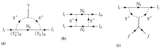 With respect to the traditional seesaw scenario, the extra suppression can predict small vales of with TeV scale sterile neutrinos and unsuppressed Yukawa couplings. The CLFV signature of the scotogenic model have been studied with particular attention to processes [48,49,50], while the phenomenology of and conversion into nuclei has also been discussed [51]. In Figure 5, we show a selection of diagrams giving contributions to CLFV processes at the one-loop level.