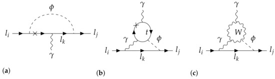 Charged lepton flavor violation is mediated by neutrino mixing. In Figure 1, we show a representative diagram for decay, illustrating that this is a consequence of the flavor-changing interactions in Equation (11). The amplitude of this process can be generically cast in the following form (see, for instance, Chapter 6, Section 6.2 of [24])):