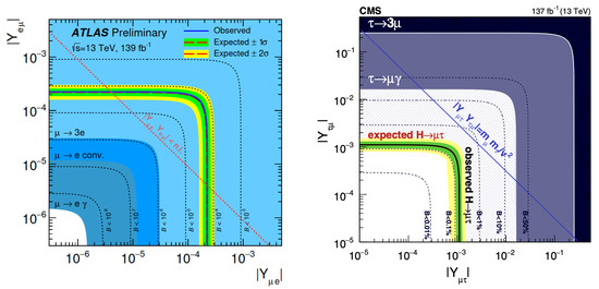 Off-diagonal Yukawas are also indirectly bounded by other LFV processes, as they can mediate through the loop diagrams shown in Figure 7. The two-loop diagrams of Figure 7b,c are relevant and can be numerically larger than one-loop contributions [70] because, in the former, the Higgs line is attached to a heavy particle running in the loop and Yukawa suppression is avoided. In the sector, is the most sensitive process to LFV Yukawas, which has been extensively studied in the context of 2HDM [62,71,72,73,74]. For the sector, the bound on the radiative decay is less stringent and the Higgs LFV decays are sensitive to smaller off-diagonal Yukawas. In a simplified scenario where only the SM Higgs is present, the author of [75] computed several processes in terms of generic LFV couplings , and in Figure 8, we show the current bounds (sensitivity) set by LFV observables. In 2HDM, there are also contributions from the heavy scalars, which are parametrically of similar size with respect to light Higgs LFV; while they do not suffer from the small mixing angle , the propagator yields a similar suppression .