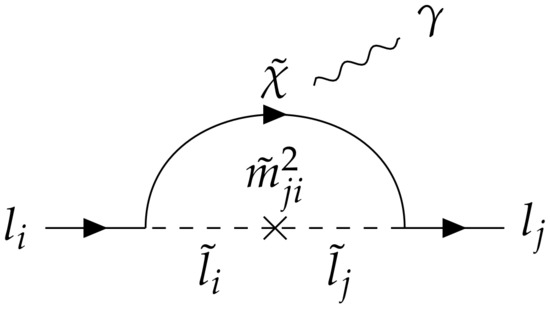 where is the diagonal lepton Yukawa. In SU(5) GUT, the down and lepton Yukawa are unified , and correspond to the transpose CKM matrix. In the diagrams of Figure 9, we show how slepton mass mixing can mediate at loop level, that in most SUSY setups is the largest LFV signal. Box diagrams exist for and , but the processes are often dominated by the penguin diagrams, where a flavor diagonal current is attached to an off-shell photon in the diagrams of Figure 9. The rate of in minimal SU(5) GUT has been calculated in [87,88]. A detectable signal is predicted in upcoming experiments, although the values considered for the sparticles masses are in tension with more recent LHC data [89].