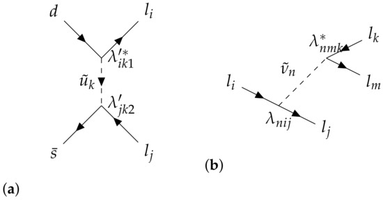 - Dreiner, H.K.; Kramer, M.; O’Leary, B. Bounds on R-parity violating supersymmetric couplings from leptonic and semi-leptonic meson decays. Phys. Rev. D 2007, 75, 114016. [Google Scholar] [CrossRef]