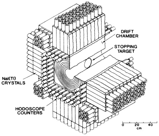 - Bolton, R.D.; Cooper, M.D.; Frank, J.S.; Hallin, A.L.; Heusi, P.A.; Hoffman, C.M.; Hogan, G.E.; Mariam, F.G.; Matis, H.S.; Mischke, R.E.; et al. Search for rare muon decays with the Crystal Box detector. Phys. Rev. D 1988, 38, 7. [Google Scholar] [CrossRef]