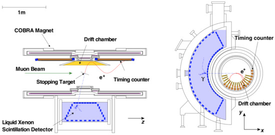 - Baldini, A.M.; Bao, Y.; Baracchini, E.; Bemporad, C.; Berg, F.; Biasotti, M.; Boca, G.; Cascella, M.; Cattaneo, P.W.; Cavoto, G.; et al. Search for the Lepton Flavour Violating Decay μ+→e+γ with the Full Dataset of the MEG Experiment. Eur. Phys. J. 2016, 76, 434. [Google Scholar]