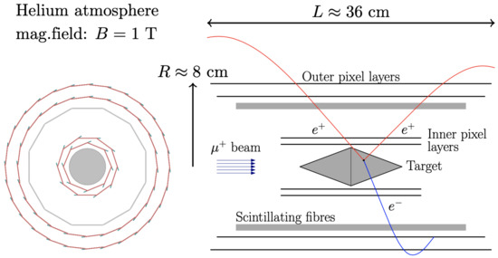 - Berger, N. et al [Mu3e Collaboration]. The Mu3e experiment. SciPost Phys. Proc. 2021, 5, 20. [Google Scholar] [CrossRef]