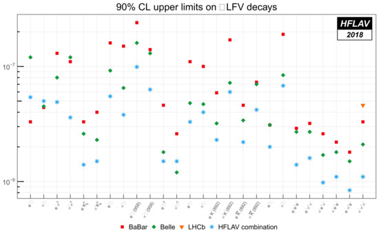 - Banerjee, S.; Chrząszcz, M.; Hayasaka, K.; Hayashii, H.; Lusiani, A.; Roney, M.; Shwartz, B. HFLAV-Tau 2018 Report. 2019. Available online: https://hflav.web.cern.ch/content/tau (accessed on 23 December 2021).