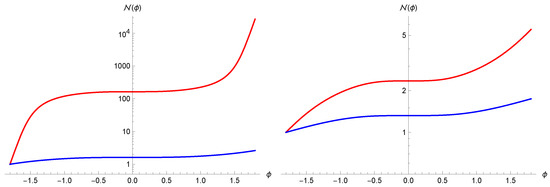 Number of particles as function of time (Ashtekar variables in blue, volume variables in red) for two different values of the initial condition ( on the left, on the right).