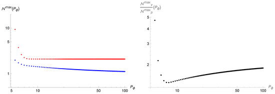 Now it is possible to numerically solve Equation (16) for and to find and from the Friedmann Equations (13) and (14) and from the ansatz (15) respectively. In Figure 2 we see the evolution of the total number of particles as function of time for two different values of the initial condition ; as we can see, in the case of the Ashtekar variables the production of particles (and therefore of entropy) is negligible with respect to the volume representation. In Figure 3 we see the final number of particles in the two cases and the ratio between them as function of the initial condition ; we see how a greater value of (and therefore a more dominant scalar field density) suppresses the creation of particles in both cases, and the ratio reaches an asymptotic value, while on the other hand for small values of the ratio grows appreciably. It is worth stressing that the different behaviour outlined above between the entropy creation in the polymerization of the Ashtekar-Barbero-Immirzi connection or of the volume variable has a precise physical meaning in the polymer paradigm only. However, since in the considered semiclassical dynamics when matter creation is absent the two polymer pictures mimic the and schemes of LQC respectively, we are legitimated to suppose that our results might be valid also in the LQC theory and could represent an important phenomenological difference between the two schemes.