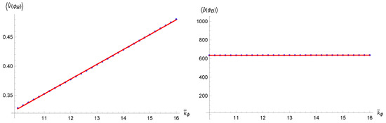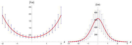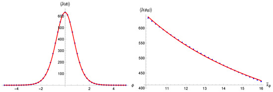 Expectation values of the volume (left) and of the density (right) at the time of the Bounce as functions of (blue dots), fitted with functions in accordance with the semiclassical evolution (full red lines).