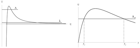 Inthe region between and , defined by , we can apply quantization of by using the Bohr–Sommerfeld formula in the the WKB approximation [70], because for the spectrum is discrete (for the spectrum is continuous). As we are interested in the positive values of , we can transform this region, by introducing the variable where is defined by , into the well between and , shown in Figure 1 (right), and formed by the axis and the potential curve where