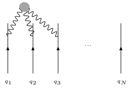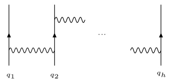 The power in N of the coupling constant may be found, as follows. Any Feynman diagram involving quarks must contain h quark–antiquark–gluon vertices, so that each quark emits a gluon line: a factor is present. Then, the quarks have to be “linked”. Linking two quarks, by the exchange of one gluon, costs at least one quark–antiquark–gluon vertex or a three-gluon vertex with one outgoing gluon line, i.e., a factor g. There are at least such links, so the dominant Feynman diagrams are proportional to , in agreement with [5,40]. One can, therefore, state that the h-quark coupling constant is such that