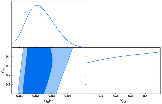 The helium abundance, , can be measured by the cosmic microwave background (CMB) since the damped tail of the CMB anisotropies is affected by the free electron density between the helium and hydrogen recombination, which is modified by variations in [21]. Using this method and allowing to vary as a derived parameter in the framework of CDM model, Planck Collaboration et al. [22] gave the following constraints from the Planck TT, TE, EE, and lowE datasets at a 95% confidence level:
