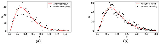 where denotes the effective depth of the sample. Considering that the majority of FRB detection lies most likely at lower redshifts , we firstly created a sharp cutoff with and, conservativelym generated 500 samples up to (the conservative case). On the other hand, since the future SKA measurement has sufficient sensitivity to detect high-redshift FRBs, we also set to generate 2000 samples up to for comparison (the high-redshift case). The fiducial values of the related parameters were: , , , , and to generate , and the obtained sampling results are shown in Figure 2 for these two cases.