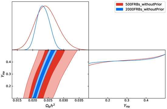 In Figure 1, we see that the current 17 FRB data had very limited constraining ability for the helium abundance, whose posterior distribution was almost flat. The main reason is that the redshifts of these 17 FRBs are relatively low, while the helium abundance is associated with the universe at higher redshifts. Therefore, it is impossible to understand cosmological information at high redshifts through these FRBs with low redshifts. Second, in Figure 1, we also show the constraint on the baryon energy density , which was also very weak compared to other observations. According to Equation (5), there is a strong degeneracy between and , which was also confirmed in the two-dimensional constraint of Figure 1. Therefore, it is very difficult to obtain useful results only from the 17 current FRBs’ data.