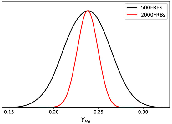 Then, we moved to the high-redshift case with more FRB data and a higher redshift distribution up to . Since the obtained error bar on the parameters should be smaller with , we expect that the constraint on the helium abundance would be improved by a factor of 2. In practice, we used the 2000 mock FRBs and the shift parameters to perform the analysis and obtain the standard deviation of the helium abundance , which was slightly better than we expected, as shown in the red line of Figure 4. We think that this is due to the redshift distribution of these mock data, which was higher than the conservative case. We could have more information from the high redshift universe to study the helium abundance, which would be helpful to improve the constraint on . In the future, the SKA project expects to detect FRB samples with redshifts up to 14 [58], which implies FRB could be a very promising probe to study the high-redshift universe.