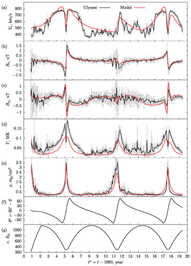 Figure 2 shows the simulation results (red line) in comparison with satellite measurements (black line) for: (a) radial velocity , (b) radial magnetic field , (c) azimuthal magnetic field , (d) temperature , and (e) density as functions on the time along the Ulysses orbit. In figures (f) and (g), the latitude and the heliodistance are correspondingly coordinates of the current position of Ulysses. Each point of the black line was obtained as a result of Ulysses measurements [62] averaged over the solar rotation period of 25.6 days. During this time, Ulysses made about measurements. Thus, each point of the black line is the averaging of the sample of the specified volume, while the vertical gray segments show the value of the standard deviation. Note that the considered dependencies cover the wide range of the heliodistance , which varies from 300 to 1150 due to the significant eccentricity (~0.6) of the Ulysses’ orbit.