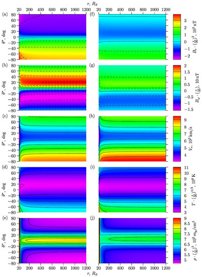 Figure 3 shows the following general characteristics of the SW as functions of the heliodistance and latitude : the radial and azimuthal magnetic components , , radial velocity , temperature , and plasma density , multiplied by their corresponding asymptotic multipliers in the form defined by (12). Due to asymptotic multipliers, the plasma and magnetic physical quantities do not depend on the heliodistance (for large heliodistance values) and can be easily compared.