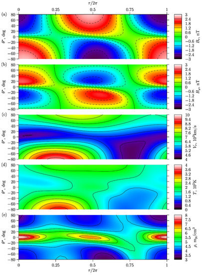 Figure 4a–d shows the dependences at the sphere of: (a) radial magnetic field , (b) azimuthal magnetic field , (c) radial velocity , (d) temperature , and (e) density on the phase and heliolatitude . This choice of the solar distance is due to the fact that at large distances the parameters of the SW almost reach their asymptotic behavior (12), which can be seen in Figure 3. In addition, the distance approximately corresponds to the Earth’s orbit. For this distance, abundant measurements provided by various satellites are available, and the model results can be reliably compared with them.