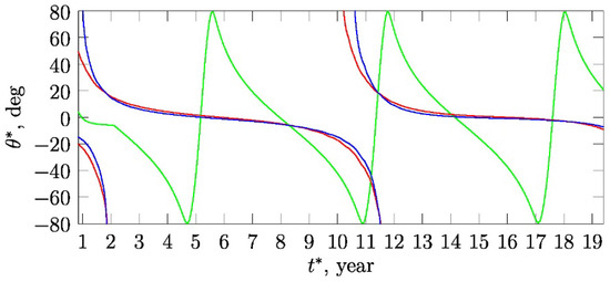 Let us have a look at the neutral surfaces in Figure 5. One can see that for a significant part of the cycle, there is a single such surface (i.e., single value of ), inclined to the equator by no more than .