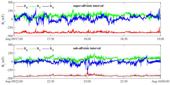 The three magnetic field components in the radial–tangential–normal (RTN) reference system for the two intervals considered in this study: (upper panel) the super-alfvénic, and (lower panel) the sub-alfvénic solar wind, respectively.