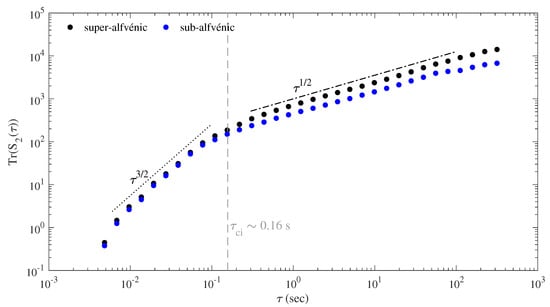 The trace of the 2nd-order structure function, Tr, for the super-alfvénic (black circles) and the sub-alfvénic (blue circles) intervals, respectively. The two scale-invariant curves, (dashed-dotted black) and (dotted black), are drawn as reference for the scalings. The vertical gray dashed line marks the proton cyclotron scale.